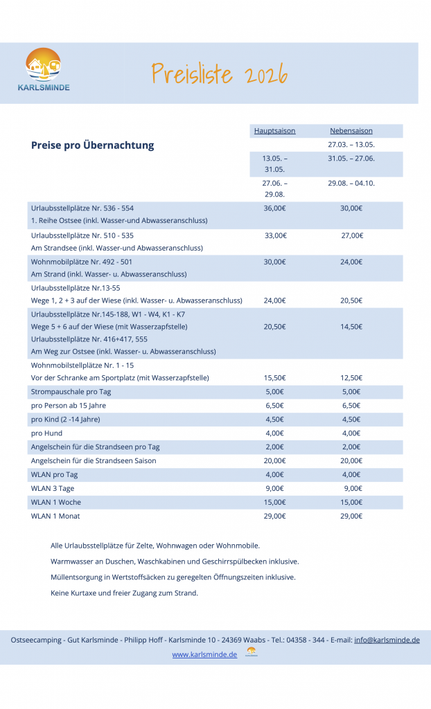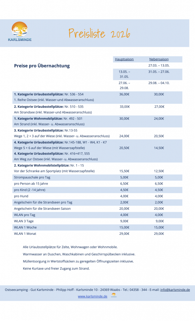 Anbei die Preisliste 2026 für den Ostseecampingplatz Gut Karlsminde.