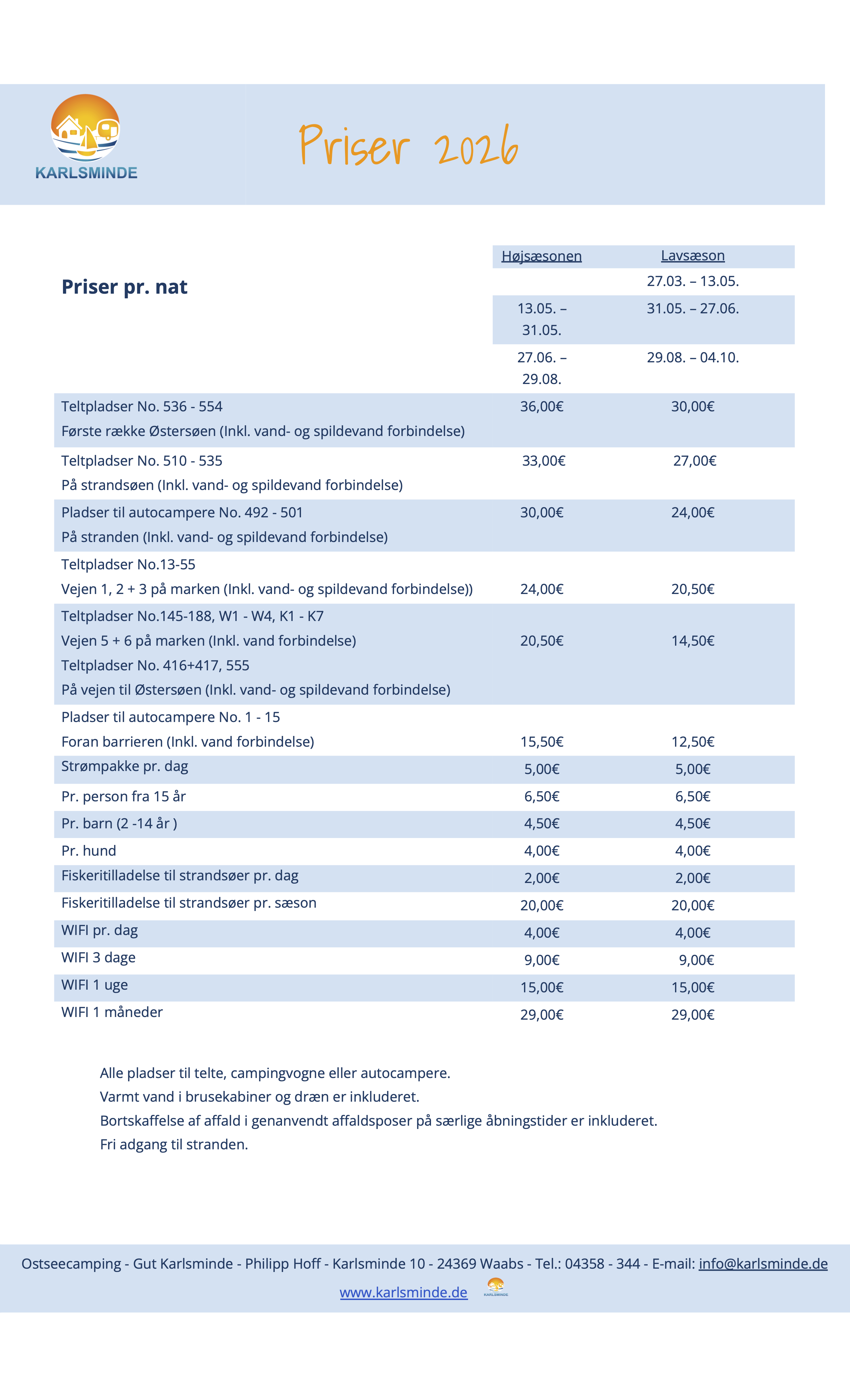 Download her priser 2026 for Ostseecampingplatz Gut Karlsminde.